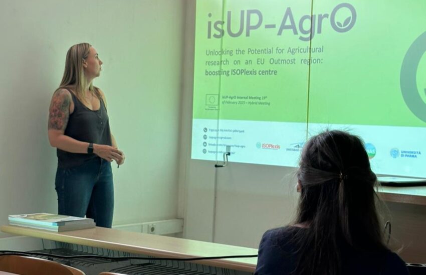 Durante a visita foi possível apresentar o trabalho do ISOPlexis – Centro de Agricultura Sustentável e Tecnologia Alimentar, sediado na Universidade da Madeira, e partilhar a visão e o progresso do projeto isUP-AgrO.